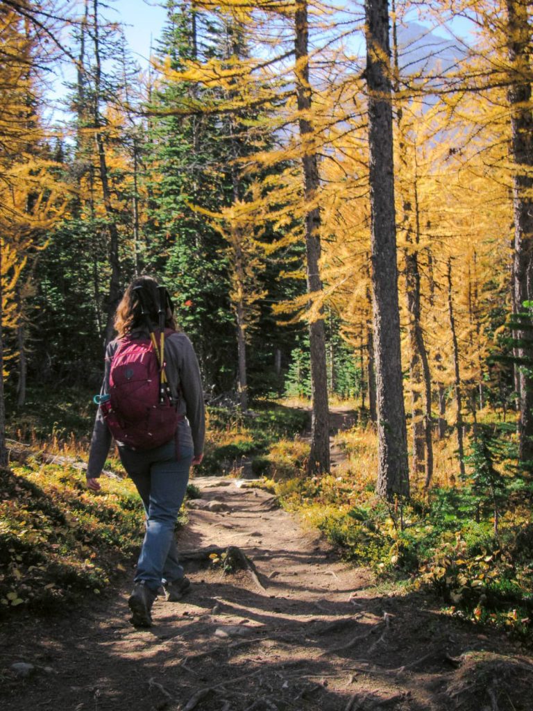 La bajada zigzaguea fácilmente hasta llegar a los lagos Minnemestima y, desde aquí, se adentra a uno de los valles más populares para visitar en otoño a las Rockies, el valle de alerces o Larch Valley.